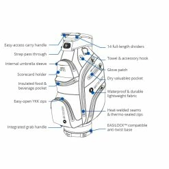 With 14 full-length dividers, club organisation has never been easier, with included rain hood for complete club protection in adverse weather conditions. Added features such as the scorecard holder, towel & accessory hook, Velcro glove patch and internal umbrella sleeve, make this bag accessible and exceptionally convenient to use, with easy hoist handles and anti-twist base for seamless cart mounting.