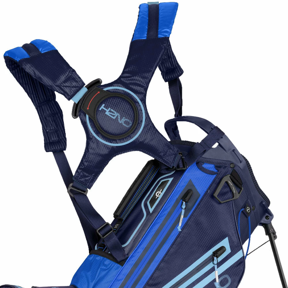 The bag has an E-Z dual lite strap system which is easy to get on and off and a lift assist handle built into the lower spine pocket. The top mounted patented roller bottom leg mechanism keeps the bag in place as you take your shot. The new comfort hip pad provides additional stability as you move around the course.