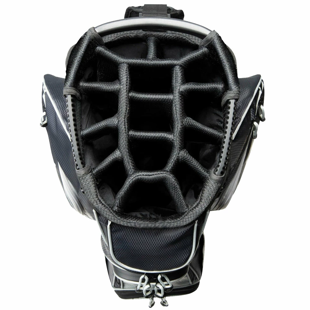 The bag weights just 2.6kg so can be easy transported around the course. The 9.5 inch, 14-way top provides excellent club organisation, with each club easily accessible. This system also provides excellent protection by stopping the shafts of each club snagging with others.